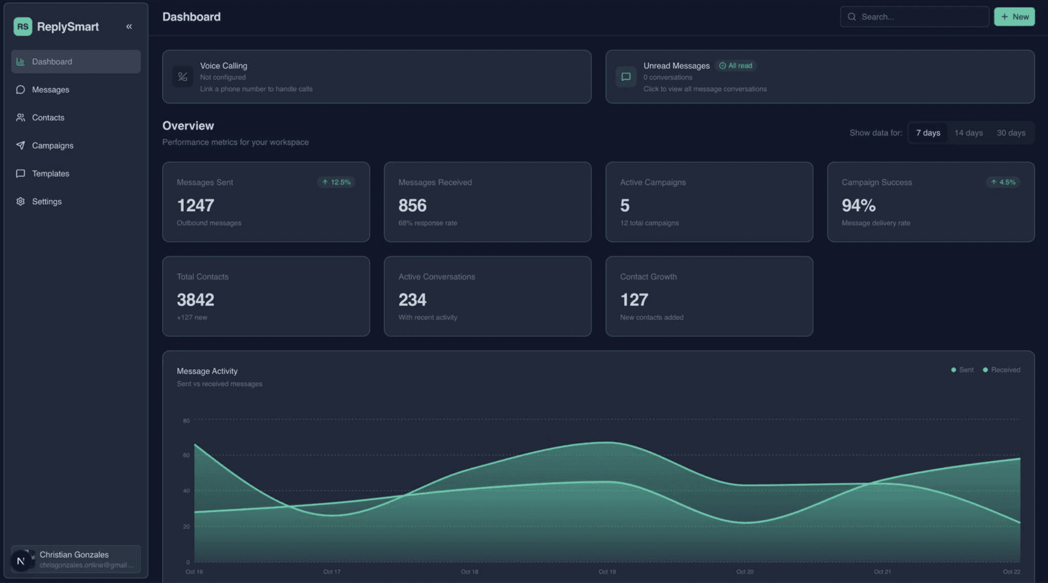 Your entire business at a glance. Track messages sent, responses received, and campaign performance—all without clicking through endless tabs.